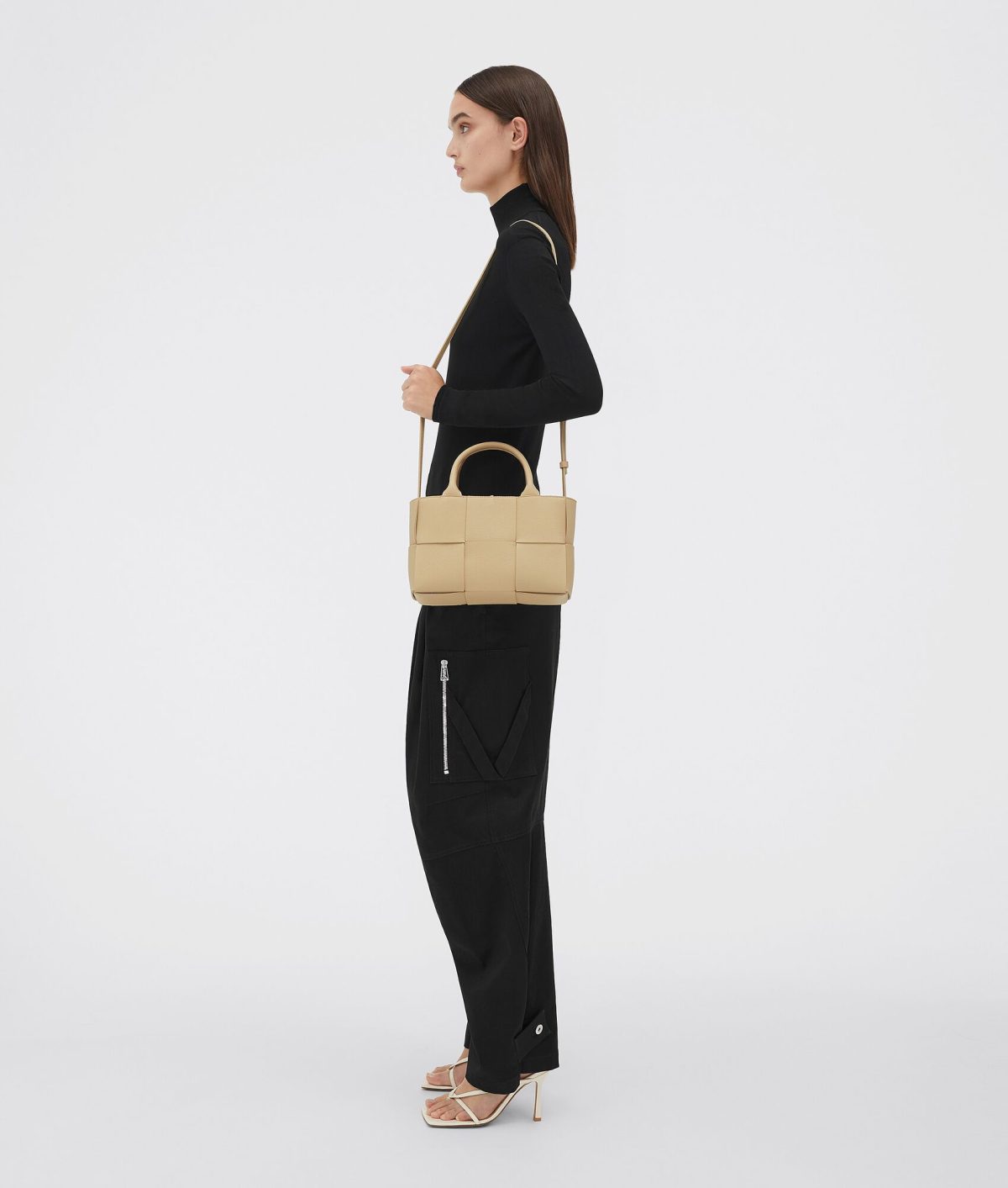 • Lining: Bonded suede Intreccio • Color: Porridge • Hardware: Gold finish • Height: 16 cm | 6.3" • Width: 25 cm | 9.8" • Depth: 8 cm | 3.1" • Handle drop: 11 cm | 4.3" • Strap drop: 50 cm | 19.6"