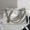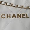 This horizontal version of the 22 Hobo Bag is made of white crinkled calfskin with gold-tone hardware and features signature diamond quilting, gold-tone metal CHANEL lettering on the front, a removable pouch and a long gold-tone and white leather chain.