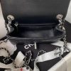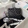 This Chanel Mini Square Pearl Embossed Flap Bag is crafted in black lambskin with antique silver hardware. It features a front flap with signature CC turnlock closure, tonal stitching, rear half-moon pocket, single interwoven black leather and antique silver chain link shoulder/crossbody strap with adjustable chain link “pearl” ball stopper.