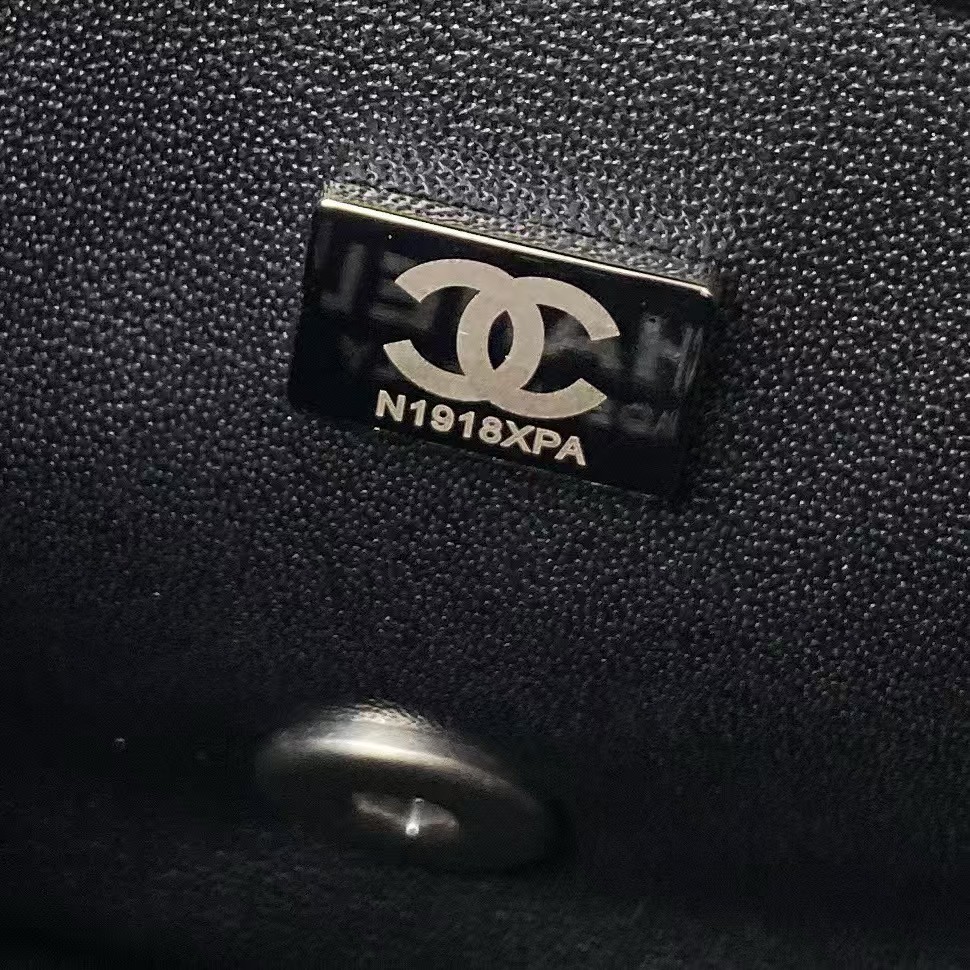 The interior is lined in black lambskin with a zippered pocket with Chanel zipper and an open pocket underneath.