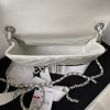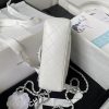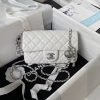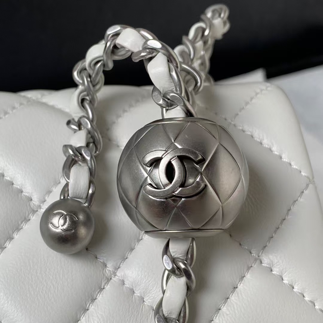 This mini rectangular pearl flap bag is crafted in white lambskin with brushed silver hardware, front flap with signature CC turnlock closure, rear half-moon pocket, single interwoven white leather and brushed silver chain link shoulder/crossbody strap with adjustable pearl ball.