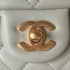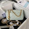 This Camellia Crush Mini Rectangular Flap bag is in Rose Clair lambskin leather with antique gold tone hardware and features a front flap with CC turnlock closure, back half moon pocket and adjustable interwoven antique gold tone chain link shoulder/crossbody strap with camellia flower attachment.