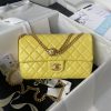 The Camellia Crush rectangular flap bag in Rose Clair lambskin with antique gold hardware features a front flap with CC turnlock closure, rear half-moon pockets and an adjustable antique gold interwoven chain shoulder/crossbody strap with camellia accents.