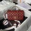 This mini flap bag features a metal top handle, crafted from red lambskin with gold-tone hardware, front flap with CC turnlock closure, half-moon back pocket, top handle and single interwoven antique gold-tone chain link and red leather shoulder/crossbody strap.