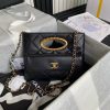 Measurements: 7.4 × 9.8 × 1.2 in / 19 × 25 × 3 cm This exquisite Chanel evening bag captivates with its elegant design and luxurious details. The pure black body, reminiscent of a starry night, is both simple and sophisticated. The intricate diamond pattern and iconic gold double-C logo exude understated luxury, while the unique handle adds a touch of charm and playfulness. The classic black and gold combination makes it a perfect accessory for evening events and formal attire.