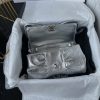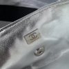This Chanel Mini Bow Crossbody Bag is made of metallic silver shiny lambskin with light gold hardware, lambskin bow shape, signature CC logo with light gold hardware, buckle closure, silver leather and light gold chain interwoven shoulder/crossbody strap.