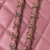 Measurements: 8.8 × 8.8 × 2.3 in / 22.5 × 22.5 × 6 cm This Chanel Star bag is crafted from pink lambskin with light gold hardware and features a half-moon back pocket, zip top closure and interwoven light gold chain and pink leather shoulder straps. The interior is lined with pink leather and canvas with two open slip pockets on each side wall.
