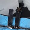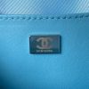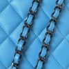 This Chanel CC Star bag is crafted in sky blue satin with black hardware and black leather trim. It features an exterior back slip pocket, a double zip top closure and interwoven black metal chain links and blue satin leather shoulder straps.