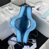 The interior is lined with sky blue grosgrain canvas and black leather with two open slip pockets on each side wall.