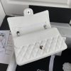 Measurements: 6 x 9.9 x 2.5 in / 15.5 × 25.5 × 6.5 cm This medium classic double flap bag is crafted in white caviar leather with silver-tone hardware, featuring the signature CC turnlock closure on the front flap, half-moon back pocket, adjustable interwoven silver-tone chain and white leather shoulder strap. The interior is lined with white leather and features a "love letter" zippered compartment under the first flap, an "outside" open pocket under the second flap, and an interior compartment with two open pockets separated by a "lipstick" compartment in the middle.