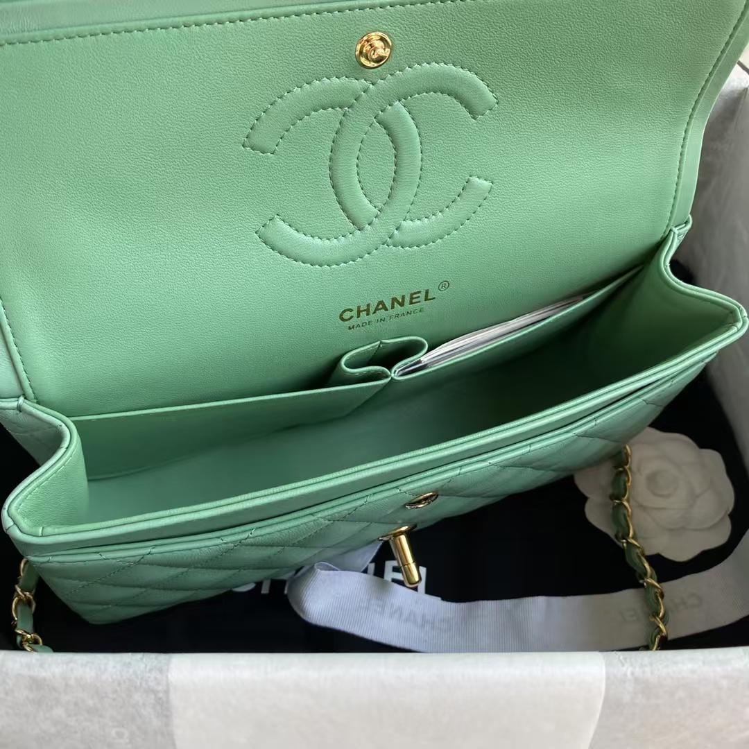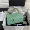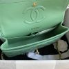 Measurements: 6 x 9.9 x 2.5 in / 15.5 × 25.5 × 6.5 cm This medium classic double flap bag is crafted in green leather with light gold hardware, featuring the signature CC turnlock closure on the front flap, half-moon back pocket, adjustable interwoven light gold chain and green leather shoulder strap. The interior is lined with green leather, with a "love letter" zip compartment under the first flap, an "outside" open pocket under the second flap, and an interior compartment with two open pockets separated by a "lipstick" compartment.