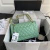 This medium classic double flap bag is crafted in green leather with light gold hardware, featuring the signature CC turnlock closure on the front flap, half-moon back pocket, adjustable interwoven light gold chain and green leather shoulder strap.