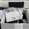 This medium classic double flap bag is crafted in white caviar leather with silver-tone hardware, featuring the signature CC turnlock closure on the front flap, half-moon back pocket, adjustable interwoven silver-tone chain and white leather shoulder strap.