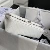 The interior is lined with white leather and features a “love letter” zippered compartment under the first flap, an “outside” open pocket under the second flap, and an interior compartment with two open pockets separated by a “lipstick” compartment in the middle.