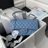 Measurements: 6 x 9.9 x 2.5 in / 15.5 × 25.5 × 6.5 cm This medium classic double flap bag is crafted in blue lambskin with silver hardware, front flap with signature CC turnlock closure, half-moon back pocket, adjustable silver interwoven chain and blue leather shoulder strap. The interior is lined with blue leather, with a "love letter" zippered compartment under the first flap, an "outside" open pocket under the second flap, and an interior compartment with two open pockets and a "lipstick" compartment in the middle.