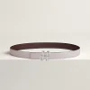 Belt buckle in metal. This season the iconic Hermès "H" has been transformed into the feminine and curved hunting horn-inspired Cor Baroque. & Reversible leather strap in Swift and Epsom calfskin.