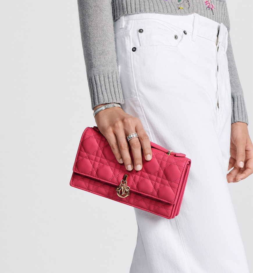 • The My Dior mini bag elevates the line with an elegant and functional design. Crafted in passion pink lambskin with Cannage stitching, it features a flap enhanced by D.I.O.R. charms on the front. Equipped with compartments and card slots, the functional accessory holds all the essentials and is the ideal day and evening companion. A top handle completed by a removable chain punctuated with resin pearls allows the bag to be carried by hand or worn crossbody.