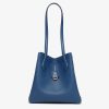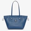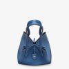 Medium Origami Bag. The style recalls the duality and creativity of Fendi with an innovative and transformable design: the ingenious closure with eight magnets means the bag can be folded, origami-style, transforming it from a bucket bag, when the magnets come together in the middle with a magic clasp, into a shopper by gently pulling the leather ties on the short shoulder straps on each side. Made of blue full-grain leather. It comes with a key case charm with the words “Fendi Roma” in metal. Lined inner compartment and gold-finish metalware. It can be carried by hand or worn on the shoulder thanks to the two calfskin handles.