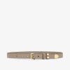 Slim belt with double loop and square buckle. Made of dove gray leather. Decorated with a metal FF logo tag on one of the loops. Gold-colored metal tip. Gold-finish metalware.