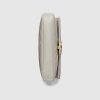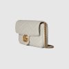 This GG Marmont mini bag is crafted from a light grey matelassé chevron leather. The signature Double G hardware in antique gold-toned defines the accessory, while a detachable leather card case completes the style.