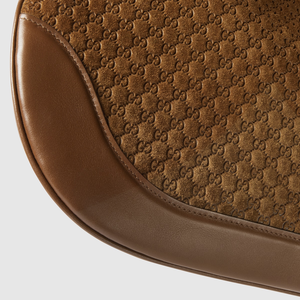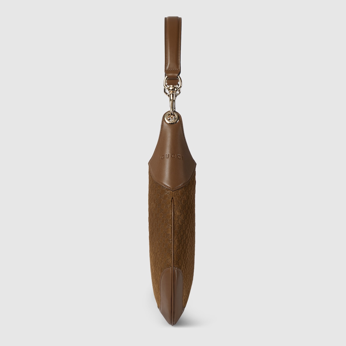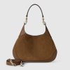 Introducing the Gucci B, which draws inspiration from a 1950s archival style. This shoulder bag, embodying the essence of its mid-20th century design origins, is crafted from soft suede and has an additional shoulder strap for crossbody wear.