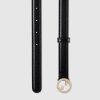 Taking inspiration from archival elements, the Round Interlocking G logo continues to define a selection of leather accessories. The 1970s inspired logo appears on this black leather belt.